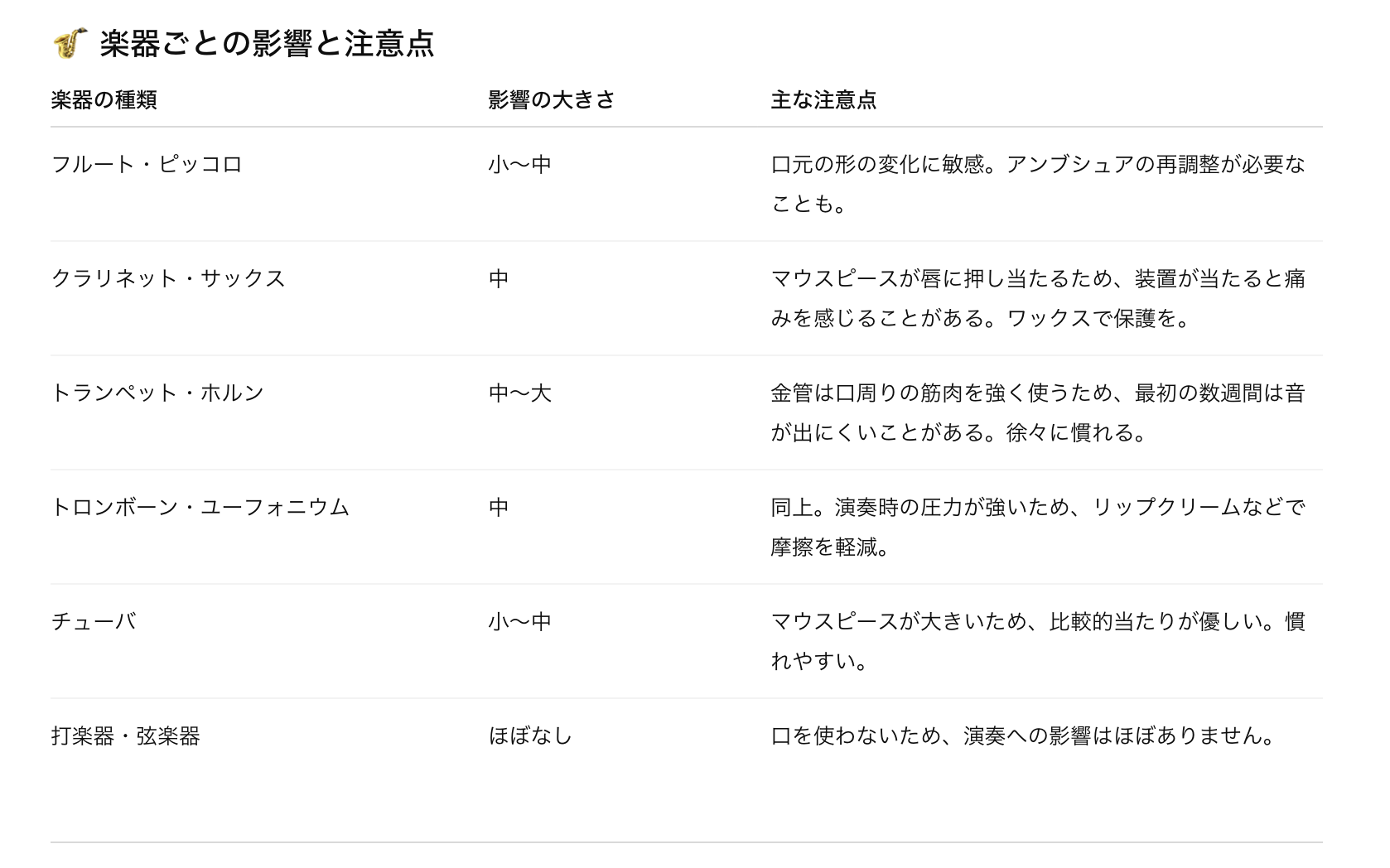 音の出し方(発音・アタック)と高音域のコントロールに一時的影響が出ます。口唇・前歯にかかる圧と舌位の微調整が必要になります。