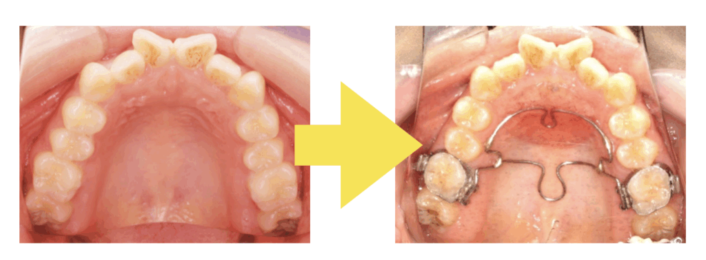 ↑ 上顎にホールディングアーチつきパラタルバーを装着したところ